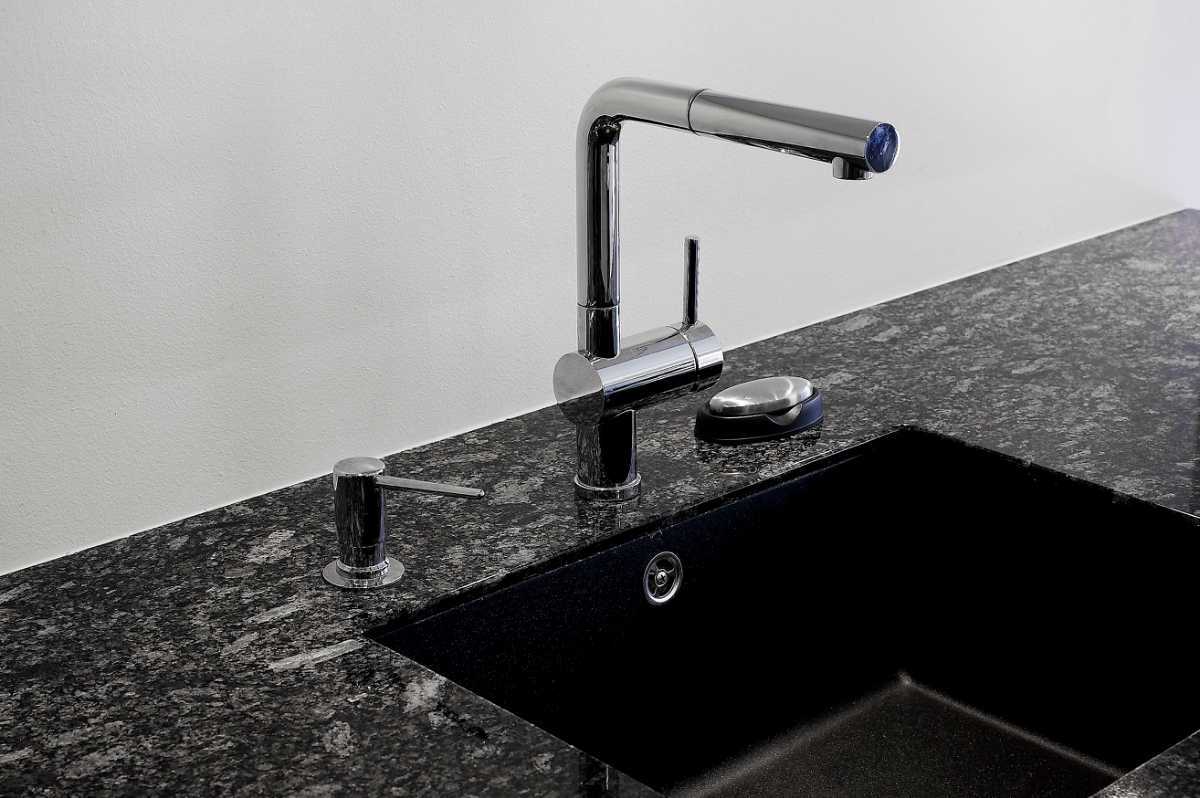 Bänkskiva i Mahogany med kvartspostad framkant och bakkantslist. Blandare: Blanco Linus